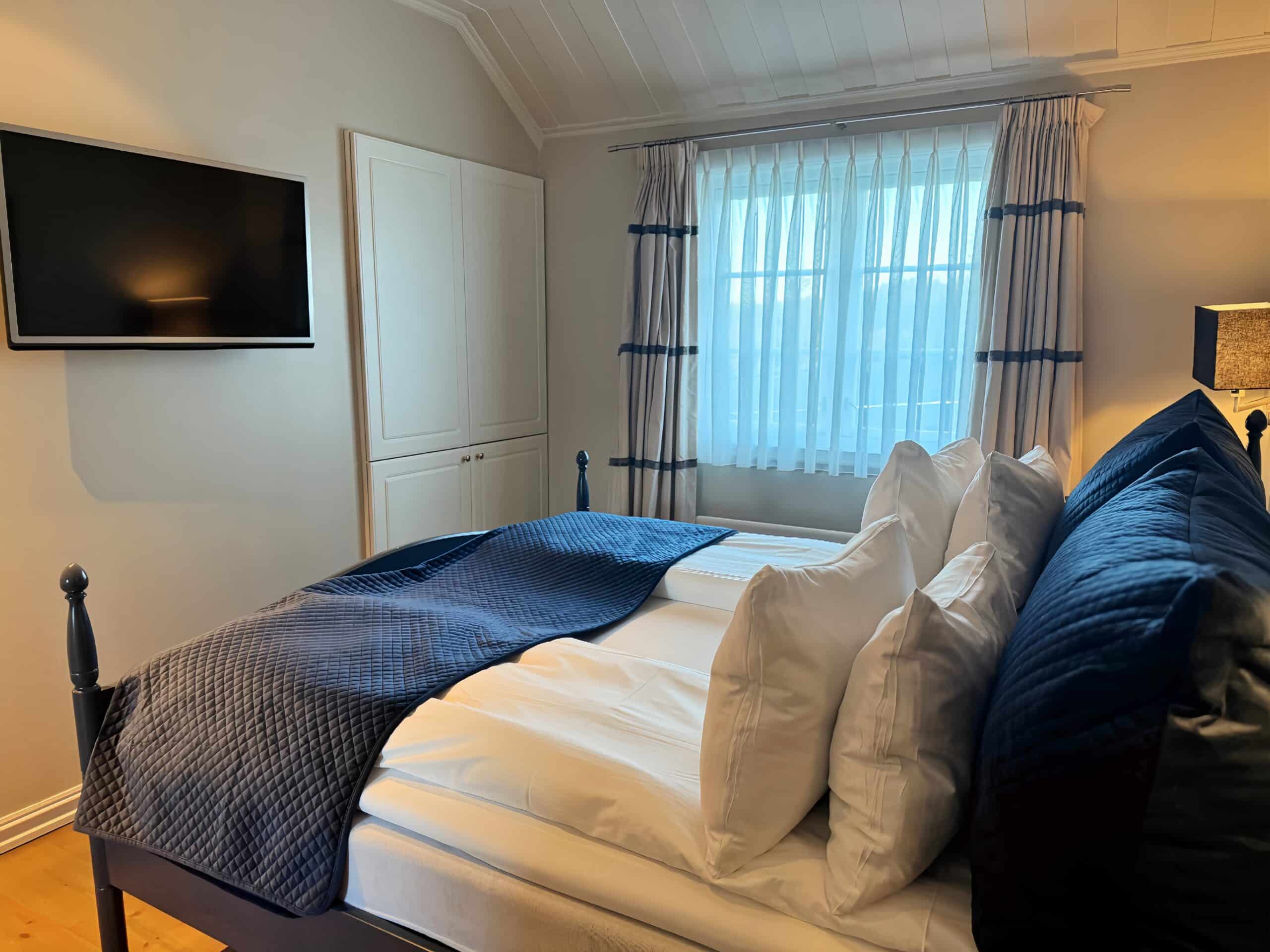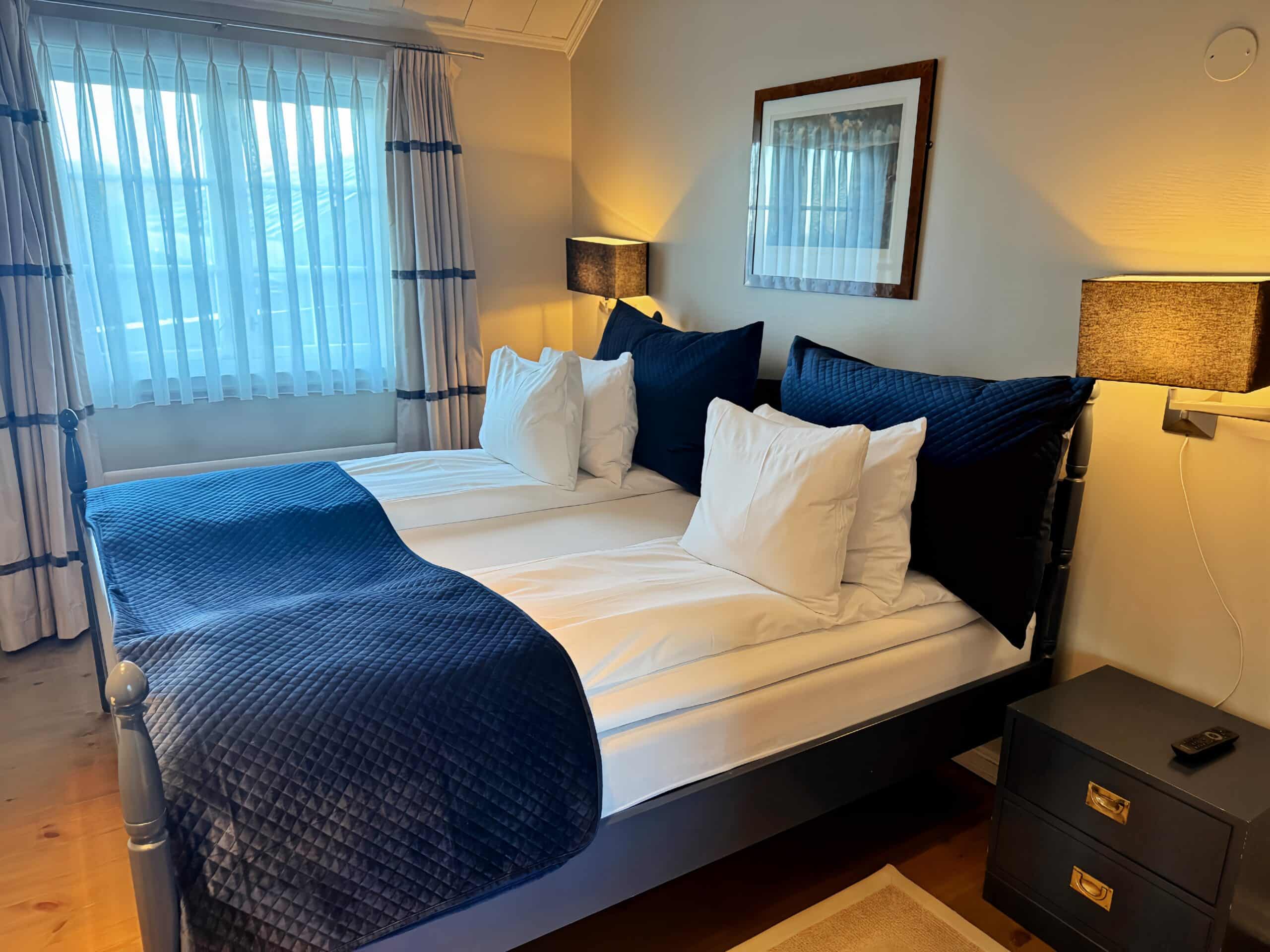 Tastefully decorated suite with a double bed in a separate bedroom and a balcony with a beautiful view. Extra bedding is available. The suite features its own sofa area, dining table, desk, wardrobe, and a large, elegant bathroom with a rain shower and wellness products from RÅ Organic Skincare.